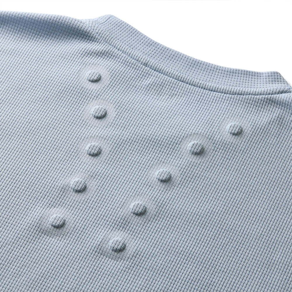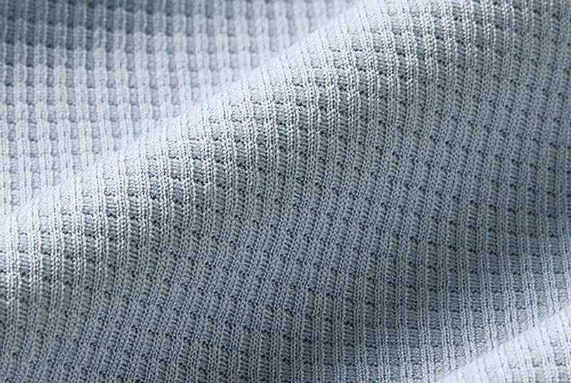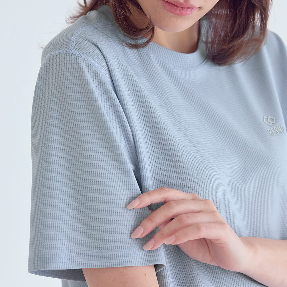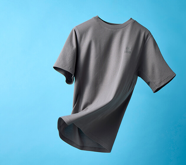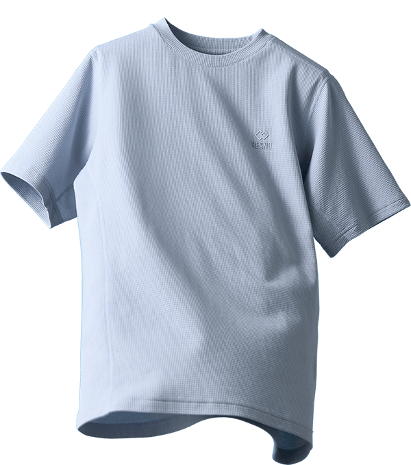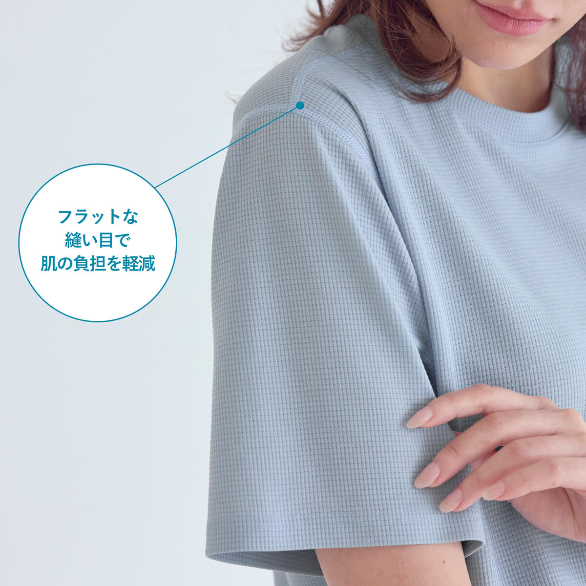 肌側と外側を編み分けたワッフル構造の凹凸生地により肌離れよく、汗をかいてもベタつきません。