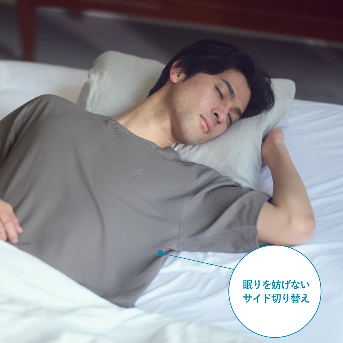 フラットな縫い目と、肩線及び脇縫いを前身頃側にずらしたことで、肌ストレスを軽減、寝返りの打ちやすい設計です。
