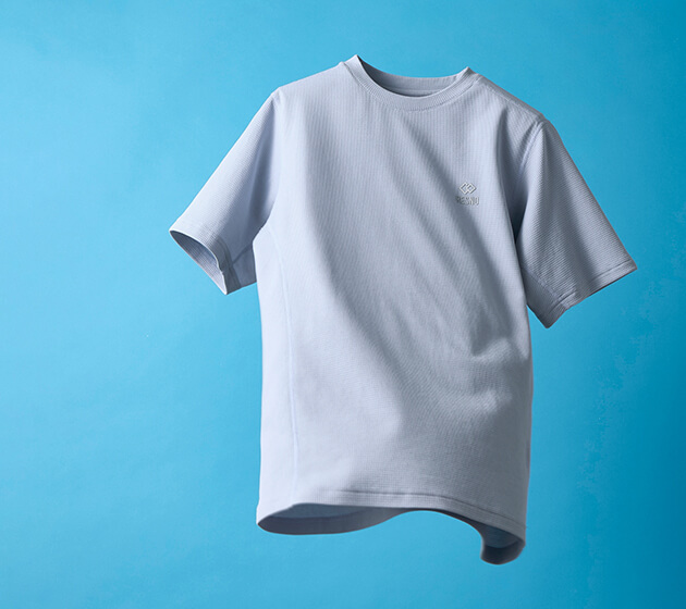 適度に空気の層を保ちながら通気性に優れた立体的な編み組織で表面はポリエステルでさらりとドライ、肌面は綿で優しい肌触り。