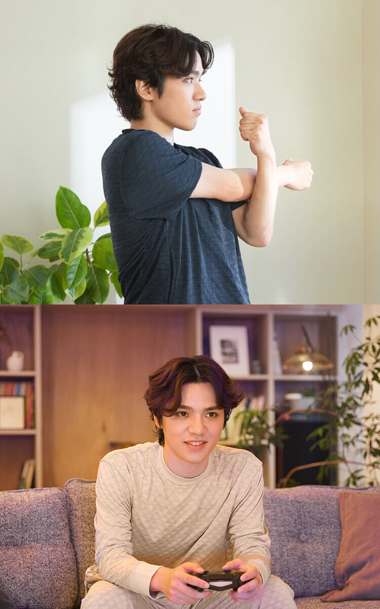 凸凹の生地・Switch-Tex™(スイッチテックス)は、体の動きにともなって皮膚と擦れることで、心地良いリラックスタイムへと導きます。